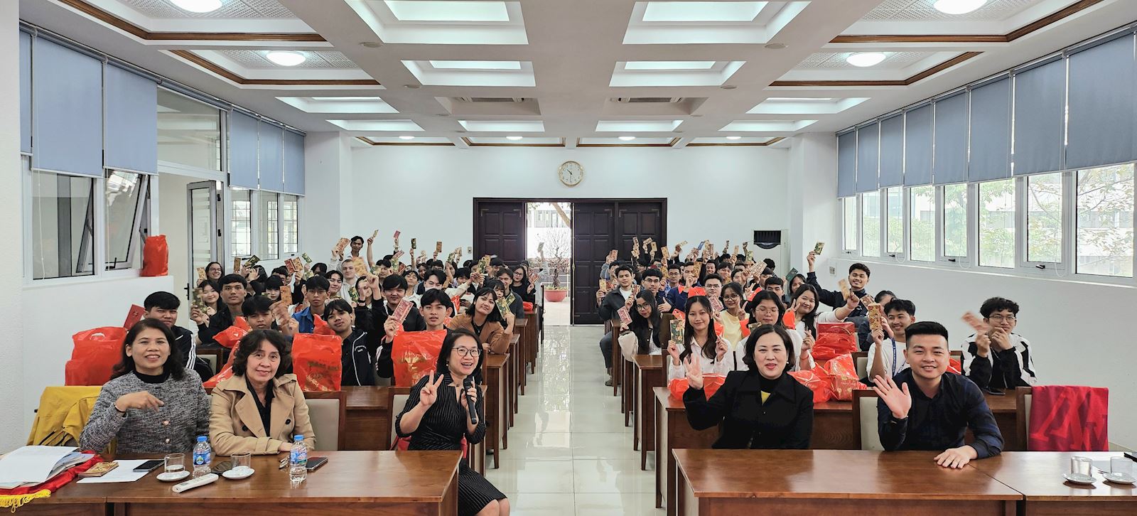 The most meaningful activity of the program was the gift-giving ceremony. The representative leaders from HUCE personally presented international students with traditional green sticky rice cakes (bánh chưng) and lucky red envelopes (lì xì), conveying wishes for a healthy, successful, and peaceful New Year. The subsequent "Quiz with Prizes" on the theme of the Vietnamese Lunar New Year was incredibly lively, allowing international students to both excitedly receive gifts and gain interesting knowledge about Vietnamese customs and traditions.